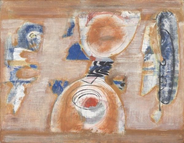 Editor: This is an Untitled piece by Mark Rothko, made around 1945 or 1946 using mixed media. I’m really drawn to the sort of primitive or primal feel it has, but I am curious as to what context it may have emerged from. What do you make of this painting, especially thinking about its historical background? Curator: This work signals a key transition in Rothko’s career, moving from Surrealist-influenced figuration towards pure abstraction. He created it right after the end of World War II. I see it as a reflection of the era's anxiety and the search for new forms of expression amidst the global devastation and trauma of the Holocaust, which influenced much art and philosophy at the time. Do you notice the organic, almost biomorphic shapes floating on the canvas? Editor: Yes, definitely. They almost resemble cells or primordial organisms. But how do you connect those shapes to the historical context? Curator: Think about what was happening in the art world at that moment. European artists, fleeing the war, brought Surrealism to New York. The use of biomorphic shapes reflected Surrealism’s exploration of the unconscious and the origins of life, so artists could move away from directly depicting the war while exploring their impact. Rothko was seeking a visual language to express profound human emotions – loss, anxiety, hope. Can you see that tension within it? Editor: Now I do! I hadn't considered the Surrealist influence so explicitly. It's interesting to think about how abstract art could reflect a response to those huge historical events, even without depicting them directly. I initially interpreted these shapes as just simple abstraction, but it takes on more gravitas with an awareness of historical context. Thanks for providing such a helpful and enlightening framework. Curator: Indeed. Examining art through the lens of its socio-political environment really enhances our understanding, wouldn't you agree?