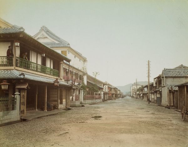Curator: Take a moment with this captivating photograph album, an anonymous work dating from the 19th to the 20th century, held here at the Minneapolis Institute of Art. It’s a gelatin silver print, capturing a street scene in Japan. Editor: My immediate impression is one of carefully orchestrated order. The street itself is the focal point, vanishing into a soft, neutral background, balanced between areas that create a sense of stillness and those that have quite dynamic movement. Curator: Yes, the ordered arrangement is quite deliberate. These sorts of albums were often produced for Western audiences eager to consume imagery of a seemingly exotic and “unchanging” Japan during the Meiji era. This photograph, like many from this period, was very carefully framed to depict a very specific view for its viewers. Editor: The use of gelatin silver print lends this piece such a nice tonal range; a silvery quality emphasizes its graphic elements of shape and contrast. See how the rounded forms of the lanterns lead the eye down the composition? It emphasizes the depth of space by repeating rounded patterns throughout, against the more jagged rooftops. Curator: Precisely. And those lanterns themselves—they speak to the fusion of tradition and commerce happening in Japan at this time. They signal bustling shops while evoking traditional celebrations. This melding would appeal to those abroad, reinforcing Japan as an appealing trade partner, eager to show it has commerce to offer those doing business abroad. Editor: It’s intriguing how this perspective simultaneously captures a bustling street and suggests an element of suspended time through a relatively monochromatic treatment. I appreciate how light helps describe this scene. Curator: This photograph offers a window into a very particular moment, a society undergoing modernization while simultaneously cultivating an image of timelessness for the global stage. The fact that the artist remains unknown makes the work all the more a piece of the sociohistorical period. Editor: I can only look and marvel at how form creates function to invite you on a silent walk through the quiet hustle. Curator: Indeed, it reminds us of photography's complicated role in constructing and shaping historical narratives. Editor: I'd say this piece, despite being anonymous, feels meticulously thought out to explore every possible angle of line, shape, and subject.