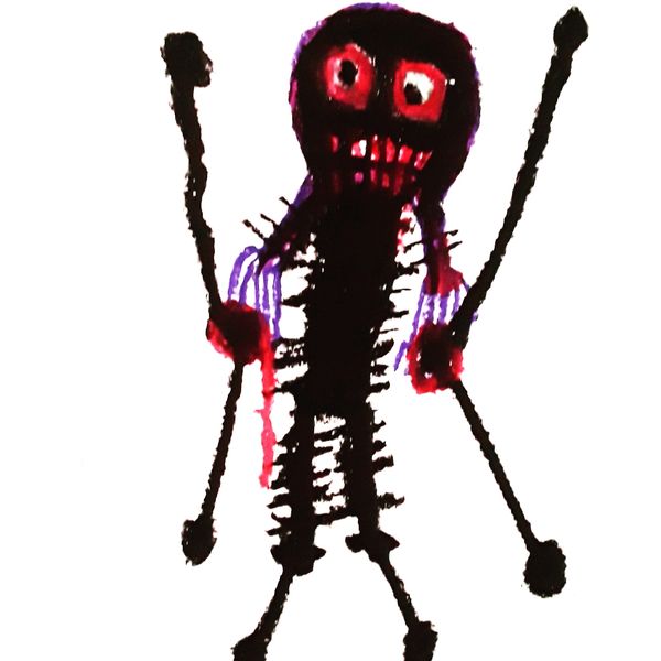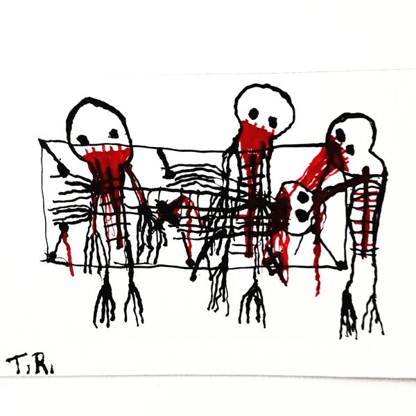 Thomas Riesner made this image with paint on paper; I can really feel the movement that he must have used to create it. Look at the red paint: it’s drippy, it’s washy, it’s immediate. The texture of this piece is what really grabs me. The stark white background almost highlights the physicality of the paint. You can see the strokes, the way the colors blend and bleed, especially around the figure’s face and torso. It’s like Riesner wasn’t trying to hide the process, but reveling in it. That drippy red paint has a life of its own, and it's everywhere! The figure in the painting seems to be caught between worlds, trapped behind the red square acting as a grid. I am reminded of the work of outsider artist, Henry Darger. Both Riesner and Darger create unsettling images which seem to be deeply personal and cathartic. Like much art, this piece embraces ambiguity, inviting multiple interpretations rather than offering fixed meanings.