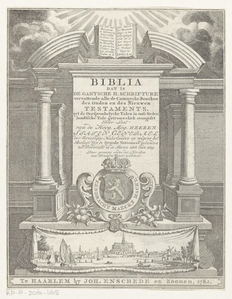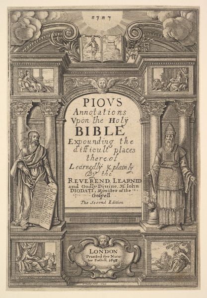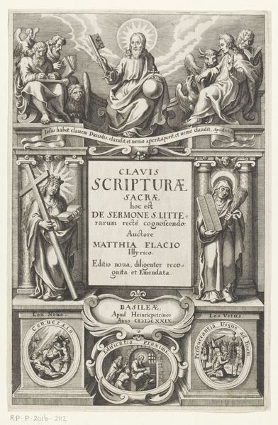 Editor: Here we have Frans Brun’s “Moses, Christ, and Portrait of Martin Luther,” made in 1648. It’s a detailed engraving with a lot going on; I find it kind of overwhelming. How do you interpret this work? Curator: At first glance, it presents itself as a straightforward religious image, yet, a closer look reveals a rich layering of cultural memory. Note how Moses and Christ flank a central inscription: the Bible, retranslated by Luther. Can you sense the visual tension? Editor: A little, I think. It feels like three different ideas mashed together. Curator: Precisely! The artist seems to be building an argument, visually. Consider the placement of Luther's portrait. He's framed by angels, mediating between the Old Testament represented by Moses and the New Testament, embodying Christ. How does this placement shape your understanding? Editor: It puts Luther in a very important position… almost like a saint himself. Is it meant to give Luther authority? Curator: Indeed. It suggests Luther is the bridge, the interpreter connecting these traditions for a new audience. And what about the swan image at the top, or the lamb above the open bible? Editor: Hmm…The swan could be about purity, and the lamb...sacrifice? I'm not sure, I hadn't even noticed the swan. Curator: These are key symbols linking back to specific doctrines within Lutheranism. This engraving wasn't merely decorative. It served to reinforce religious identity. A powerful image, speaking volumes through its dense symbolic language. Editor: That's really fascinating. I would have just seen this as a religious engraving, but now I realize how much more is actually being communicated. Thanks!