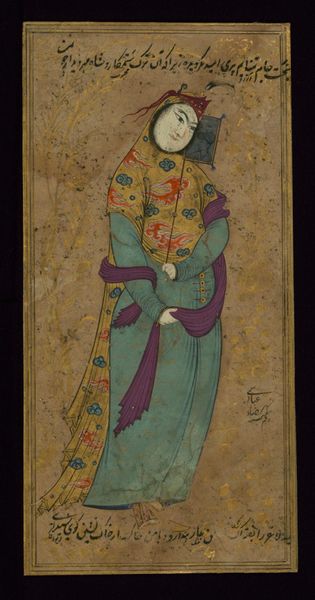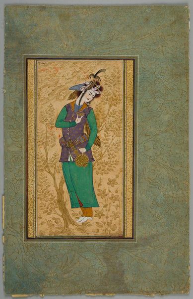 Curator: Look at this piece; it's captivating, isn’t it? Editor: It is! There's such a sense of quiet opulence to it all. I am drawn to the almost dreamlike quality... the colors, composition—everything feels softly removed from reality, even if just by a whisper. Curator: Indeed. The work you are seeing here, "Man in a Fur-Lined Coat," created between 1575 and 1625, comes to us from the celebrated artist Riza-yi 'Abbasi. It's crafted using ink, tempera, and watercolours on paper. It currently resides here, at The Metropolitan Museum of Art. Editor: "Man in a Fur-Lined Coat"... Such a descriptive, literal title, yet it's brimming with an almost secretive world. Curator: 'Abbasi was an incredibly influential figure during the Safavid period. The use of this 'type' portrait, with one central figure dominating the pictorial space, suggests a reflection of both power and individual identity during this period. Miniatures like this also became coveted commodities, often gifted between the powerful and affluent, thus serving to advertise one’s connection to political power. Editor: Almost like an Instagram post of the era—flexing the good life and all! And the patterns framing the portrait only amplify the richness, don’t you think? They almost seem to hold and guard the scene within. There’s so much symbolic weight in those borders themselves, containing this little world inside the miniature! It almost looks like I am peeking into the past through the doorway! Curator: It reflects the tastes and patronage networks within the Safavid court culture, especially under Shah Abbas I. And, interestingly, miniatures such as this became accessible and a form of royal and upper-class self-fashioning that helped codify status within an expanding imperial milieu. The portrait operates as a piece of self-display—cultural, political and even intimate—all bundled in one striking image! Editor: Absolutely. You’ve given me a lot to think about here... this artwork really sparks something! Curator: Hopefully it does for you, too, as you continue through the exhibition!