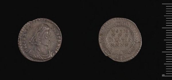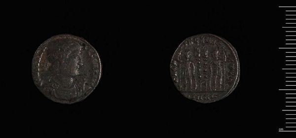 Editor: This is a Follis of Crispus, from Heraclea. The artist is Crispus himself. It's incredibly small, but detailed. What strikes me is how the circular composition contains two distinct, almost opposing, images. How do you interpret the coin's structure? Curator: The coin presents a study in contrasts. The profile of Crispus, a static representation of power, faces the architectural rendering of what appears to be a fortified structure. Consider the material itself; the metal provides a tactile and lasting medium for conveying authority and permanence. Editor: So, it's about how the form conveys meaning? Curator: Precisely. The incised lines, the bas-relief, even the wear and tear contribute to its narrative. This piece is not merely currency; it's a carefully constructed object meant to communicate specific ideals through visual language. I noticed that the architectonic figure has what seems like a star above, adding another layer to the composition. Editor: Fascinating! Seeing how the composition emphasizes those contrasts really changes how I view it. Curator: Indeed, it is a testament to the power of visual communication, even in miniature.