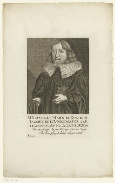 Curator: So, here we have Christian Romstet’s "Portret van August Pfeiffer," dating sometime between 1665 and 1721. It’s an engraving, which always fascinates me. Editor: It strikes me as a portrait imbued with the gravity of scholarship. There's a certain... heaviness to the composition, perhaps enhanced by the darker tones typical of engravings. But let's talk about this 'engraving' part... what were these early processes *really* like? Curator: Well, an engraving like this involved meticulously carving lines into a metal plate, usually copper, applying ink, and then pressing it onto paper. Imagine the labor, the focused precision! It feels a world away from our digital age. I imagine Romstet feeling he's capturing the sitter's very soul in the lines... Editor: Absolutely, labor is crucial here! Engraving was skilled artisan work and, the materials - copper plates, inks, papers - they represent trade routes, knowledge dissemination... This wasn't just "art", this was craft meeting commerce head-on. And all that Latin text, quite exclusionary! Curator: Yes, the Latin definitely signals an educated, elite audience. And what about Pfeiffer himself? The portrait exudes this sense of dignified seriousness, almost like he’s contemplating profound theological mysteries right before our eyes. That frilled collar is so starched! I almost feel I know more than I ought to. Editor: Materially, that collar tells a story. The labor in making the lace, the social codes it implies... portraits like these weren't simply about likeness. They were statements of status, reliant on production chains we often forget when seeing them in pristine gallery conditions now. He looks quite 'important' -- what exactly did he do? Curator: August Pfeiffer was a prominent theologian and doctor, hence the open book suggesting scripture and learning. Romstet subtly reveals both Pfeiffer's intellectual prowess and the weight of tradition on his shoulders. It all lends the piece a quiet sort of contemplative energy, wouldn’t you agree? Editor: I see the energy more as *contained*. Look at that gesture -- it reads as more self-controlled that it does revealing to me. Regardless, looking closely at art objects through this lens gives us a fuller understanding not only about this person, but of the networks and materials circulating around him in his lifetime. It does lead us down intriguing historical paths. Curator: Exactly, the threads of history embedded in its making. Fascinating, indeed!