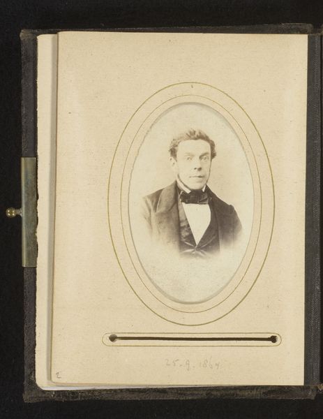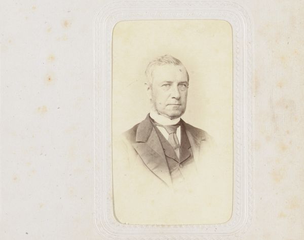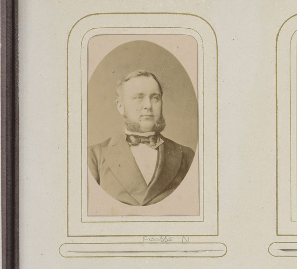 Editor: Here we have a charming portrait from the mid-19th century, "Portret van een zittende man met bakkebaarden", which translates to "Portrait of a seated man with sideburns," created sometime between the 1850s and 1860s by Hermanus Philippus Jacobus Schuiten. It’s an albumen print, which gives it this wonderfully soft, almost dreamy quality. There's a kind of stoicism in the man's expression, and the oval frame adds a sense of formality. What do you see in this piece? Curator: It’s like gazing into a lost world, isn’t it? The albumen print process… it gives everything this sepia-toned nostalgia, a whisper of the past. Notice the detail in his coat, versus the deliberate blurring of the background - this pushes him forward, into our space. Schuiten is capturing more than just likeness here, he is presenting an idea, a societal role perhaps. Makes you wonder what his story was. What kind of life did he lead? Editor: That's interesting. I hadn't thought about the blurring as a way of focusing on his social role. So much attention is given to the details of his suit, as well. Almost like a status symbol. Curator: Precisely. What would you have thought if Schuiten had added a mischievous glint in his eye or mussed his hair a little bit? It really highlights how deliberate these images were; these aren't casual snapshots, these are crafted identities. Photography at this stage was still relatively new and imbued with a sense of ceremony and considered presentation. Do you feel you can see that ceremonial tone in his gaze? Editor: I definitely see what you mean. I initially saw him as stern, but now, thinking of that era, "composed" might be a better word. It really makes you think about the stories behind these antique photographs. Curator: Absolutely. And the best art always makes you ask those questions, doesn't it? Editor: Definitely a new way to view a formal, older piece such as this. I appreciate your insights.