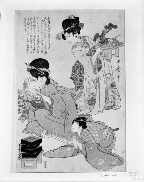 Curator: Katsushika Hokusai's print, "Boys Playing Sugoroku," also known as "The Pink Shell," presents a scene from the series "Shell-Matching Game with Genroku Poets." Editor: There's a distinct domesticity here. The stark lines almost suggest a blueprint, a mapped-out social space. Curator: Indeed. This work, dating from the Edo period, reflects the era's cultural fascination with games and social rituals, particularly the blending of aristocratic pastimes with emerging commoner culture. The sugoroku board game becomes a stage. Editor: The materiality is intriguing; the woodblock printing method itself necessitates a collaborative, almost industrial process. How were these prints consumed, and by whom? Curator: They circulated widely, becoming accessible forms of art. Hokusai democratized images that would have previously been reserved for the elite, challenging traditional hierarchies. Editor: So, it is not just a game, but a playful subversion of class structures rendered through material production. Curator: Exactly. It shows how art can both reflect and subtly reshape social norms. Editor: I'm struck by how much the process shaped its cultural impact. Curator: And I’m left pondering how the intersections of class, play, and artistic production have evolved since then.