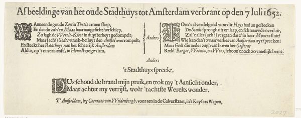 This anonymous print from 1629 celebrates the Dutch Republic's capture of 's-Hertogenbosch from the Spanish. It's a piece of propaganda, meant to bolster national pride and solidify support for the ruling House of Orange. The text is written in Early Modern Dutch, a language undergoing standardization at this time. The poem equates the city of 's-Hertogenbosch with a 'virtuous bride' being united with Prince Frederick Henry, a heroic groom. It casts the military victory as a joyous marriage, a powerful metaphor designed to evoke feelings of national unity and divine approval. The work reflects the cultural and political climate of the Dutch Golden Age, a period marked by economic prosperity, artistic flourishing, and a struggle for independence. The reference to ‘Batavieren’ appeals to a national myth that served to create a sense of shared history. To understand this image, you need to delve into the history of the Eighty Years' War and the role of the House of Orange in forging a national identity. Primary sources such as pamphlets, chronicles, and diplomatic correspondence can shed light on the complex interplay of politics, religion, and culture in this pivotal moment in Dutch history.