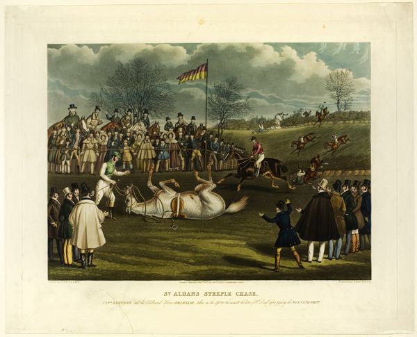 Charles Bentley captured this scene of "The Winning Post" from the Grand Leicestershire Steeplechase, employing etching and aquatint. The horse, a symbol of power and aristocracy, is central, evoking ancient equestrian statues and the classical ideal of man and beast in harmonious unity. Note the dynamic posture of the leaping horses, a motif echoing the "horror vacui" seen in classical battle scenes, where every space is filled with action. This resonates with the human psyche's fear of emptiness, a desire to control and conquer space, mirroring the riders' ambition. Consider the raised arms of the spectators—a gesture of victory, of acclaim—a primal expression that transcends time. We see it in ancient Roman triumphs and persists even today in modern sporting events. This symbol of triumph highlights the enduring human quest for recognition and superiority. The visual language of power and victory is not linear but cyclical, reappearing, and evolving across centuries.