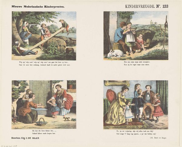 Curator: Looking at "De Kleine Savoyaard" by Jan de Haan, dating from 1875 to 1903, it’s fascinating how a simple print can open up broader social commentaries. What’s your initial impression? Editor: Well, at first glance, it feels like a series of somewhat disconnected vignettes showing this boy, supposedly from Savoy, in different situations. He seems to be travelling, maybe seeking work or just trying to survive. What strikes you the most about this work? Curator: The core narrative here touches upon themes of child labour, poverty, and displacement, issues deeply embedded in 19th-century European society. We see the boy in varied scenes - struggling with labor, facing potential exploitation and possible salvation through art. Consider how this work reflects the era’s debates about childhood innocence versus the harsh realities faced by many children. Does this shift your initial interpretation at all? Editor: Absolutely. I hadn't thought about it in terms of child labor so explicitly. The seemingly random scenes gain a sharper, more critical edge when viewed through that lens. But, does the "genre-painting" label normalize or perhaps even romanticize his hardship? Curator: That's an astute question. Does art of this type risk aestheticizing poverty, or can it act as a powerful tool for social awareness? Perhaps, this work prompts us to consider how our own perceptions are shaped by distance – both temporal and social. The tension is always present. Editor: So, by bringing contemporary theoretical perspectives, such as critical race studies or feminist theory, we can explore intersectional narratives of identity and socioeconomic injustice in a much more critical, profound manner. Curator: Exactly! Understanding art requires placing it within layers of context. Looking at this print reminds us that the aesthetic appreciation must go hand-in-hand with social and historical understanding. Editor: That's a lot to consider. I'll definitely approach this type of artwork differently moving forward.