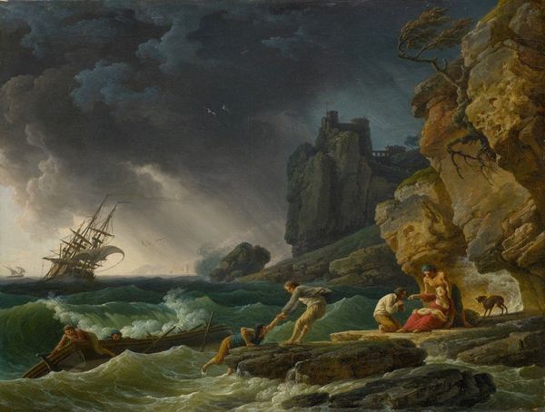 Editor: So this is "An Italian Harbour in Stormy Weather" by Claude-Joseph Vernet, made around 1740-1750. It looks like an oil painting, and the mood is… dramatic. What I find striking is the contrast between the struggling figures and the indifferent, overpowering storm. What do you see in this piece? Curator: I see the theatricality of the Enlightenment. Vernet wasn't just painting a storm; he was painting an experience of the sublime, tailored for the salons and collections of the elite. Consider the rise of the Grand Tour during this period. Patrons wanted souvenirs, visualizations of their travels, often enhanced for dramatic effect. Vernet fulfilled that need. Editor: So, it's almost like a landscape designed to impress? Curator: Precisely. These paintings reinforced a sense of mastery, even in the face of nature's fury. By positioning these almost theatrical 'common' figures in a very controlled composition of sublime landscape, he subtly reinforced the viewers' socio-economic positions by marking them with aesthetic sensitivity, which at the time was thought to be absent from the lower classes. Does that change how you view the piece? Editor: It does! I hadn't considered how the image might be speaking to ideas about class and control. I was so focused on the storm, but now I see that it’s almost a backdrop. Curator: Think about the placement of the lighthouse as a symbol of control against chaos and the broken ship on the horizon. Every element serves a narrative. How does thinking about Vernet’s socio-political motivations color your interpretation? Editor: It makes me think more critically about who this art was *for* and what messages it was designed to send. Thank you! Curator: Absolutely. The art wasn't for the subjects, but the wealthy that admired these landscapes of 'the commons' from afar. I'm glad that it resonates!