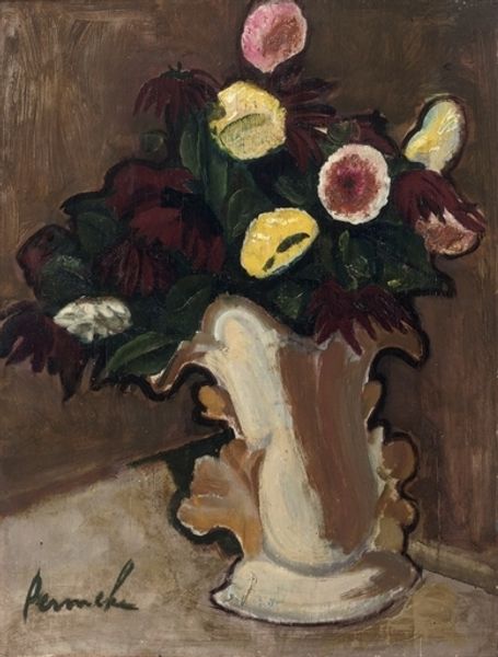 Editor: We're looking at Roderic O'Conor's "Mixed Flowers on Pink Cloth" from 1916, an oil painting bursting with vivid color. There's a raw, almost feverish energy to it; the brushstrokes feel so immediate. How do you interpret the energy in this piece? Curator: It strikes me as an exploration of fleeting beauty, doesn't it? Think about it: flowers, a symbol of ephemeral existence, rendered with such passionate, almost frantic brushwork. The pink cloth beneath... it's a comforting element, yet it can't contain the riot of color and emotion above it. Do you think he's capturing joy or a struggle with beauty's transience, or perhaps both at once? Editor: I like the idea of both. It definitely feels less like a carefully arranged still life and more like a moment seized. The redness is so dominant...almost aggressive? Curator: Indeed! The red almost vibrates against the paler pink. He was part of that Pont-Aven School crowd in Brittany, influenced by Gauguin and Van Gogh. So, that intense color and expressive brushwork are really part of that visual language - that search for deeper emotional truths rather than surface realism. How does it make you *feel*, stepping away from the art history for a moment? Editor: To be honest, it feels a little claustrophobic, like too much, but also undeniably alive. I can’t look away. It's a complicated mix. Curator: Precisely. It's an image that lingers, stirring different responses each time we meet. Maybe that's the mark of a truly great piece. Editor: Absolutely. Thanks! I'll definitely be looking at O'Conor differently now. Curator: My pleasure. These conversations are like opening little windows, aren't they?