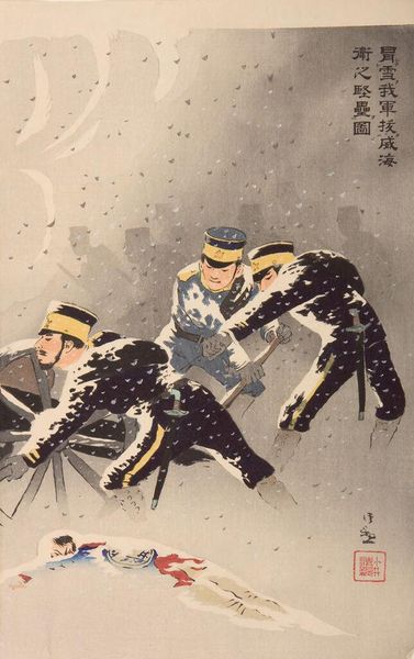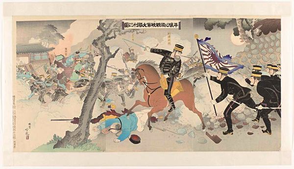 Kobayashi Kiyochika created this print of a ground attack at Weihaiwei, using traditional Japanese woodblock printing techniques. The process begins with a drawing, which is then transferred to a woodblock, usually cherry. Using specialized carving tools, the key outlines are cut. Separate blocks are prepared for each color. The printer carefully applies pigment to the blocks, and then presses paper onto the surface to transfer the image. Here, the dynamic scene, with its explosive burst of light, relies on the precision of the woodcutter’s art, and the many stages of production that would have been involved in creating the image. As we consider the final artwork, it is important to remember the labor involved in its production: from the initial sketches to the many stages of carving, inking, and printing. Paying attention to materials and making allows us to appreciate the history of craft alongside the artwork’s social and political context.