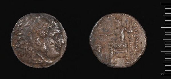 Curator: Here we have a Tetradrachm of the Chalkidian League, minted in Olynthos. It's a silver coin weighing just over 14 grams. Editor: The first thing that strikes me is how worn it is. You can really see the handling it must have endured. Curator: Absolutely. These coins weren't just money; they were a statement of identity for the Chalkidian League, a political alliance. The head of Apollo on one side, and the lyre on the other are iconic symbols of their cultural aspirations. Editor: The minting process itself is fascinating. Think about the labor that went into creating the dies, the skill involved in striking the coin just right, the preciousness of the silver itself. It represents concentrated value in material and human capital. Curator: Exactly! And consider the distribution – these coins facilitated trade, but they also projected the League's power and influence throughout the region. They were active agents of cultural exchange. Editor: Looking at the way the silver has been worn smooth by countless transactions, I’m really struck by the contrast between the grand aspirations and the everyday reality of its use. Curator: I agree. It makes you think about the relationship between economic systems and the artistic production they enable. Editor: Well, that’s a lot of history packed into a small, worn disc of silver.