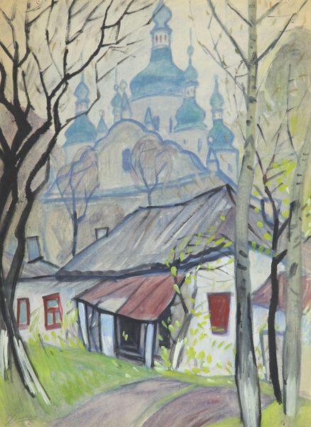 Editor: So here we have Pyotr Konchalovsky's "Cathedral of St. George in Novgorod," done with tempera and oil paint. I'm really struck by how solid everything feels. What jumps out to you? Curator: The facture. Look closely at Konchalovsky’s brushwork, the very deliberate layering of paint. This isn't just about depicting a cathedral, it's about *making* an image of a cathedral through specific processes. He wasn't aiming for pure representation, but to present the materiality of paint itself, and the labor involved. Editor: I see what you mean! The brushstrokes are really visible, it almost looks rough in places. Curator: Exactly. Consider the social context. This work emerges from a period of radical social change in Russia, where artists questioned traditional artistic values. This deliberate emphasis on the physicality of the medium – the *what* and the *how* over the *what* – rejects earlier artistic concerns with illusionism or romantic ideals, in favor of tangible and visible realities. What does this suggest to you? Editor: Maybe a focus on the everyday? Like, valuing labor and materials the way you might value the church itself? Curator: Precisely! Think about how cathedrals themselves are built – immense projects of human labor, using stone and metal. Konchalovsky, in a way, is mirroring that act of creation, isn't he? Do you see this reflected anywhere else? Editor: Yes! Even the textures, mimicking the materials of a landscape. I see a new depth now. Curator: A simple church becomes a vehicle for exploring the very act of artistic creation. Considering art through the lens of production reveals so much more than mere aesthetics, don’t you think? Editor: Definitely. I'll never look at a landscape the same way again! Thanks for making it click.