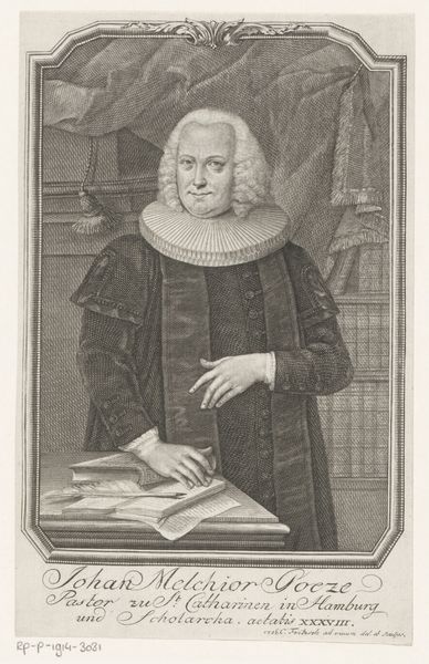 Curator: This is Pieter Tanjé's "Portret van Wigbold Muilman," an engraving created sometime between 1746 and 1757, now held here at the Rijksmuseum. What catches your eye? Editor: The wig, without question! It's a statement—a literal crown of societal expectation. Beyond that, there is an undeniable air of civic authority here. Curator: Authority is certainly conveyed. The portrait leverages a vocabulary of established visual cues, like the oval frame, the architectural detailing, and the subject's formal attire. But I find myself drawn to the paper he holds. It's a symbol of communication, of knowledge—perhaps a reflection of Muilman's role in society? Editor: Good point. In that era, access to written documents signified not just literacy but power. Was Muilman involved in commerce? Perhaps a public office? His posture suggests engagement with civic life, certainly, maybe the paper also represents this involvement. Curator: Wigbold Muilman was indeed a prominent figure in Amsterdam, heavily involved in trade and governance. And note the inclusion of the coat-of-arms above the portrait. Family lineage, inherited status – they all converge here to reinforce his position. It's very deliberately constructed. Editor: And consider the city visible through the window—the backdrop a deliberate association with a powerful, expanding urban landscape and Amsterdam’s mercantile force. These elements come together to shape and validate his importance. Tanjé captured the era, the mood of upward mobility, really, and put it on display. Curator: It brings us closer to understanding the ambitions of that era—and the values that society then held dear. To have your likeness memorialized this way…it speaks volumes about his aspirations and, frankly, the conventions around image-making in that time. Editor: So, we see it all, status symbols turned to visual emblems! It really goes to show how portraits serve as both personal markers and cultural records. Curator: Exactly, this portrait helps connect us with a rich socio-economic environment through symbolic forms. Editor: A compelling visual archive!