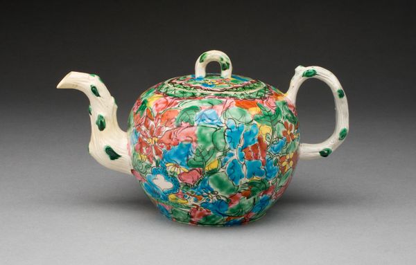 Editor: Here we have a Whieldon-type ceramic teapot from around 1745 to 1775, currently residing at the Metropolitan Museum of Art. The sculptural relief is striking; it almost feels like a miniature garden. How might you interpret its ornate decoration? Curator: I see a complex interplay between material, production, and social aspiration. Notice the labor involved in creating such intricate relief work in ceramic. This wasn't about 'artistic genius' but skilled craft and organized workshops. The material itself, ceramic, speaks to the growing accessibility of tea drinking at the time. This teapot isn't just a vessel; it’s a symbol of upward mobility, produced for and consumed by a burgeoning middle class. How do you think the pineapple motif fits into this? Editor: It definitely stands out. Pineapples were a luxury, right? Curator: Exactly. Their presence signals wealth and taste. Consider the complex supply chains involved in bringing that pineapple from the Caribbean to adorn an English teapot. This object embodies global trade, colonial exploitation, and the democratization of luxury, all wrapped up in the humble form of a teapot. Its decorative details don't just delight the eye but point to broader issues. Editor: That makes me look at the decorations in a different light, recognizing that production and social ambition were intricately tied. I guess it’s easy to overlook the complexities of the processes involved when admiring such beautiful objects. Curator: Precisely! By focusing on materiality and means of production, we move beyond aesthetics to understand how art objects like this reflect – and reinforce – societal structures. This has certainly offered a fascinating, if challenging, view.