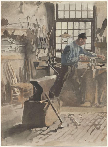 Ferdinand Hodler created this scene of a shoemaker at work using oil on canvas. Hodler’s choice of painting as a medium, rather than a craft, offers an elevated view of the shoemaker's daily labor, and elevates this scene of labor to a more esteemed position. Look closely at the painting's surface. The shoemaker is absorbed in his craft, carefully working the leather with his tools. The scene is illuminated by natural light coming through the window, which emphasizes the textures of the leather and the wood. The artist has paid close attention to detail, capturing the textures and tones of the workshop environment. Hodler's painting serves as a commentary on the value of skilled labor and craftsmanship. In an era defined by industrial advancements, Hodler draws our attention to the shoemaker's expertise, and reminds us of the enduring importance of human skill and creativity in an ever-changing world.