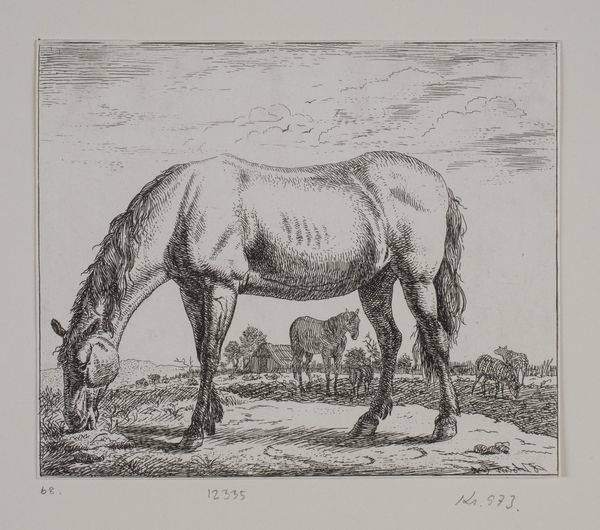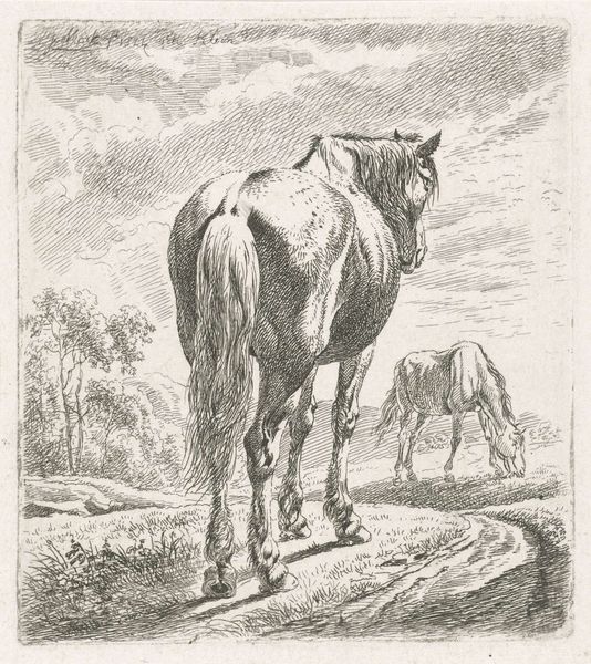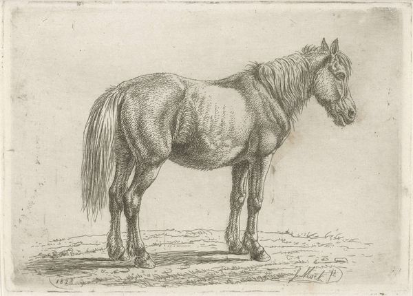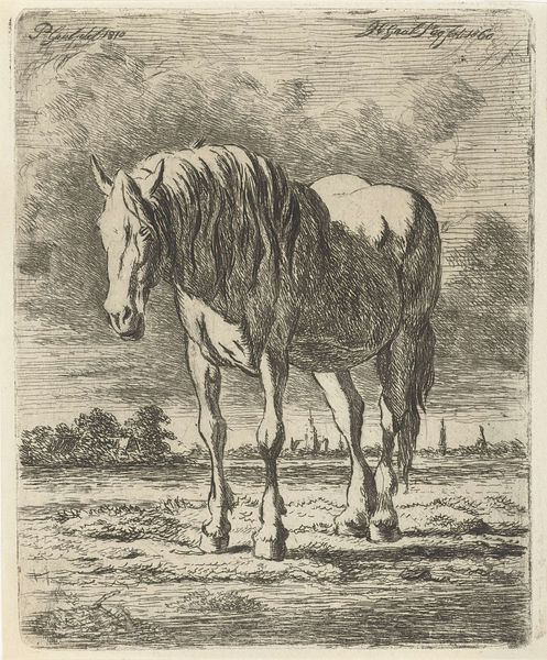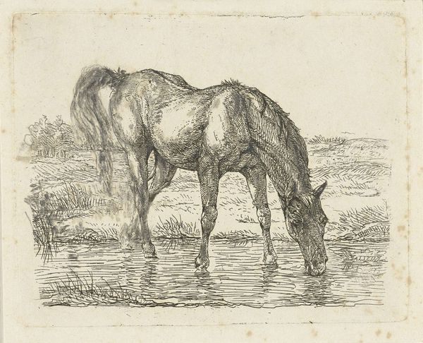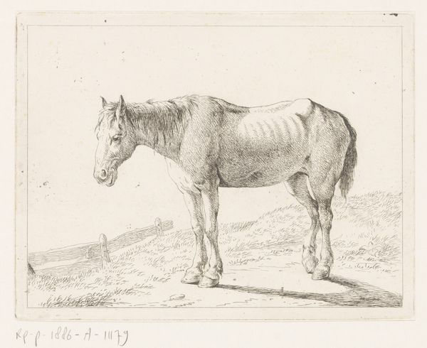 Curator: Standing before us is Jacobus Cornelis Gaal’s 1860 ink drawing on paper, "Staand wit paard," currently housed in the Rijksmuseum. The texture immediately strikes me; the sheer mass of this animal rendered so delicately. Editor: The density of line work is what initially grabs me. The crosshatching that forms the horse’s body must have taken incredible care. What does it evoke for you? Curator: There's a quiet dignity in its posture, a reserved power rendered through realism, yet softened by the nature of ink. It lacks the dramatic tension we might expect from, say, Delacroix's animal studies, doesn't it? It’s also interesting to see this horse in the landscape: the semiotics involved and his own reading. Editor: Absolutely. Consider the paper it’s drawn on—relatively inexpensive, accessible. Ink drawings often served as studies, drafts for larger works. I’m fascinated by what Gaal might have observed and rendered using basic materials and lines to capture movement. Also notice that in some parts we don't even see that kind of detailing. Curator: Precisely. The composition, as stark as it appears, provides a delicate interplay of presence and absence—that in turn is completed with an interaction of different styles and shades which the artist achieves without employing multiple inks, yet by varying the density and strength of his hand on the material. It is not only the depiction of an animal or countryside landscape, but a deep study of nature. Editor: We also can think about the labour behind it, each strike is very clear in capturing musculature of the horse in contrast with some vaguer passages like the landscape, which almost becomes background. It’s like foregrounding labor and process, don’t you think? It reflects the society and time that we lived in, especially because these kind of figures where common, this is very clear on its materiality, especially with all the features already stated: it doesn't necessarily belong to one tradition of ink drawing, as you would see in far-east Asia. Curator: A telling point, indeed. The contrast speaks volumes about intention, process and vision in approaching a familiar theme through a more familiar material. Editor: I think looking closer, we start to unpack how artistic conventions, when applied to such an ordinary subject as a farm animal, can unveil fascinating perspectives on work, materiality, and vision in its time.