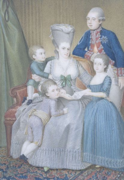 Curator: Here we have Gilbert Stuart’s "Portrait of a Family," painted in oil sometime between 1783 and 1793. Editor: It feels rather formal, doesn’t it? A bit…staged. The composition is carefully constructed, a visual assertion of order and familial harmony. Yet there’s an undercurrent of melancholy in the subjects' eyes. Curator: The clothing! The mother's towering, powdered wig. The children's fine garments. Stuart masterfully depicts their status. The textures speak volumes—the sheen of silk, the soft cotton of the children’s attire. Notice also how Stuart emphasizes specific objects. The child has these interesting small scissors attached by chain on the right, a strange thing to include, or so one may think. Editor: Yes, objects gain importance, the children frozen at certain ages—objects can represent a person as well as a class. Considering this piece's historical moment, its adherence to formal portraiture suggests a reinforcement of social hierarchies, as family wealth would continue through future generations, their "likenesses" displayed for admiration. Look at how they hold themselves. Do they look relaxed or comfortable? It’s as if all identity has been replaced by their status in this picture. Curator: There is more to their gestures than you'd see at first look, their symbolism being central to unlocking meaning here. A symbolic key or tool, if you will. For example, the gesture made by the smaller girl on the lap of the mother as it rests her palm against the stomach, this signals hope for a potential birth on the horizon. While their status in society is certainly highlighted, family hope may be the actual key message within the artwork. Editor: While the hand on the stomach could very well hold a symbol for the possible birth of another sibling on the way, to ignore class distinctions, as highlighted so meticulously within the formal portrait structure, would simply be ignoring the social and political setting in which the painting takes place. There is something inherently gendered in the image as well; a promotion of family as woman’s key domain in culture that promotes ideals of white patriarchal dominance through offspring. Curator: A portrait meant to project both status and hope for legacy—certainly ripe for varied interpretation even now. Editor: Indeed. Its impact resides in its power to spark dialogues on history, power, and family identity, prompting considerations on how representation shapes social values across time.