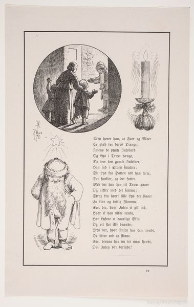 Curator: Just look at the sheer humanness radiating from this drawing. This is part of Hryhorii Havrylenko’s illustrations for Mikhail Stelmakh’s book "In the Hedgehog’s Windmill" created in 1956. It's ink on paper, that's all, yet it pulses with life. Editor: I agree. It hits you right away. There’s a wistful air, even in the face of collective labor. It's interesting how he’s managed to suggest both hardship and community with such simple lines. Curator: Absolutely. For me, it's about capturing a very specific moment—a child confronted with the realities of agricultural labor, the figures of the working women looming large. You have to remember this comes out of an era defined by social realism, even if a bit of Soviet Nonconformism managed to seep through, the pathos here is palpable. Look at that kid! Editor: And the figures of the women… They're archetypal. These women harvesting – raking, binding – represent the harvest not just materially but spiritually. These images tap into ancient earth mother symbolism - images of growth, labor, fertility that have resonated across cultures and throughout centuries. There is cultural weight being carried by their image here. Curator: Yet the artist, with a touch, conveys also a world where collective effort might just flatten individuality. He contrasts the shared effort, the smiling faces, with the boy’s feeling of being an outcast… a really powerful visual tension that you find throughout this series. Editor: Definitely. The text, what we can glimpse of it, hints at a tension between the boy's reluctance and the community's expectations. I see echoes of ancient agricultural myths: the unprepared boy versus the cycle of labor. His sadness is a direct challenge to the social order the art pretends to praise. Curator: Which makes me wonder about the artist's own unspoken commentary… I feel a strange resonance here with Bruegel's peasant scenes. We could be just looking at farmers and laborers... but might we also be glimpsing something more? I read into those "Soviet Nonconformist Art" hints… Perhaps there's quiet defiance simmering beneath the surface. Editor: Or maybe just… maybe the boy eventually pitches in and feels okay. Either way, art invites interpretations… that tension is precisely where memory and identity meet in symbolic form. It is more about the eternal themes it manages to channel through that specific snapshot. Curator: It sure does! So much evoked in such a simple composition! I think I need to revisit Havrylenko… with fresh eyes and an open heart. Editor: Same. Seeing it through that lens unlocks more and more with each pass, doesn’t it? It starts conversations within oneself and outward toward others. What more can we ask of it than that?