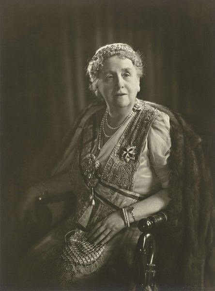 Curator: Here we have a portrait of Queen Wilhelmina, photographed by Atelier Merkelbach in 1948. The medium is gelatin silver print, with some elements of photomontage present. Editor: Oh, there's an imposing sense of duty in this image! That distant gaze says it all—weight of the crown, historical echoes... the monochrome intensifies it somehow, like a vintage film reel. Curator: Indeed. The composition employs a full-length, formal pose, adhering to conventions of royal portraiture. Note how the verticality, established by the backdrop and her stance, reinforces her stature. The lighting appears carefully managed to accentuate her features while creating depth. Editor: See, all that regalia weighs her down visually. Those opulent decorations across her gown create a tension against what feels like a surprisingly demure purse... Is that even a purse or some ceremonial object I’m not familiar with? Curator: It functions both as symbolic regalia and sartorial element; let's call it an accoutrement. Consider how it interlocks with her attire to amplify her symbolic connection with governance and national identity in the aftermath of the Second World War. The image participates within the narrative construction around European royalty, which, in this period, serves to reestablish a sense of continuity. Editor: Ah, I get it now—continuity... The '40s felt like yesterday and another lifetime simultaneously, didn’t they? Maybe I read some vulnerability into the photo that’s really her stoicism; history books always flatten a life into a job, don’t they? Curator: That very flattening provides the image its power, a sign of her place and an aesthetic experience of the very state it reflects, like gazing at an institution rather than a monarch. The photograph becomes an essay on form and power—repetition of shapes, subtle curves countering rigid lines. Editor: So what looks posed contains so much that’s actually… imposed, you mean? Thanks, I’ll think of that "formal essay" effect next time I want to get swallowed up by history.