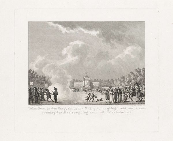 Curator: This engraving, “IJspret te Harlingen, 1823,” by Willem Hendrik Hoogkamer, depicts a bustling winter scene. Note the detailed application of the engraving, an intense and demanding production process. What strikes you initially? Editor: Well, I'm drawn to the figures populating the ice. They seem engaged in everyday activities despite the freezing weather, a snapshot of ordinary life transformed into something beautiful, or at least interesting. How do you interpret that? Curator: I look at the materiality of the print itself. Engravings were reproduced for a mass audience. This image of winter leisure wasn’t just about depicting a scene; it was about disseminating a particular view of Dutch society to a wider public through printmaking, an accessible medium. Editor: So, the choice of engraving over, say, painting, influenced the social impact? Curator: Precisely. Engraving democratized art. It allowed scenes like this one – leisure, trade, community – to circulate among different classes. Consider the labor involved in producing multiple copies; each line carefully etched, a testament to craftsmanship and the value placed on reproduction. Think also, about its distribution, and who has access to the image, thus access to the idea behind it? Editor: That shifts my perspective. I was focused on the aesthetic, but you’re highlighting the socioeconomic factors. Curator: Always! What materials were used? How was it made? And how did its mode of production influence its reception and impact? These are questions we must ask ourselves, as cultural researchers. Editor: It’s fascinating to consider this image as a product of its time, both in its depiction and its production. Curator: Indeed. By examining the material conditions of its creation and circulation, we gain a richer understanding of its cultural significance. It’s not just about what's depicted, but about how and why it was depicted in this particular way, and the labor involved, all influencing access and ideas.