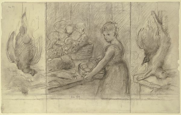 Editor: Here we have Otto Scholderer's "Still Life Triptych," created in 1889 using pastel and chalk on paper. It strikes me as a really intimate look at domestic life, almost like a faded memory. What do you see in this piece? Curator: Oh, I'm so glad you used the phrase "faded memory." It whispers to me of moments suspended, doesn't it? Scholderer has presented a still life—but disrupted it. A triptych form usually screams religious altarpiece or grand historical scene, yet he uses it for a quiet scene. Look at the ethereal sketches on either side of the main panel! They act like brackets around a secret. Editor: Secret? Curator: Indeed! Those flanking sketches–are they ghostly figures? Forgotten muses? I find myself asking what Scholderer truly intended by framing a domestic scene, a woman amidst her labour, in this somewhat spiritual way? The lines are faint, like trying to recall a half-forgotten song. Does it speak to the value of a single moment, given form? How fleeting but essential all that sustains us is, and all we long for? Editor: I hadn't really noticed how the sketch style seemed so different in each of the three sections, almost like a timeline. The woman in the centre looks much more solid, present. Curator: Precisely! It almost makes you wonder if he's inviting us to contemplate the stages of life or different states of being, from fleeting impressions to tangible realities, doesn't it? A fascinating way to make you contemplate reality and the artistic expression. Editor: That makes me think about how we usually expect a still life to be so…still. But this one feels like it's moving, in more ways than one. Curator: Absolutely. Art is so good at that. Thanks for pointing that out.