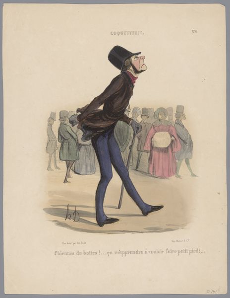 Honoré Daumier created this lithograph, "Damn Boots! That Will Teach Me to Take Smaller Steps…”, as plate 6 from Coquetterie. The exaggerated figure, rendered in stark black lines against a pale ground, leans forward, almost pitching out of the frame. Daumier’s composition uses caricature to critique social affectation, with the figure’s elongated limbs and pointed features emphasizing a sense of imbalance and artificiality. The lithographic technique allows for a contrast between areas of fine detail and more sketch-like passages, drawing attention to the performance of elegance and the discomfort it masks. The repetition of figures in the background, each a variation on contemporary fashion, suggests a world where appearances are carefully constructed. This print highlights how visual codes of posture and dress communicate social aspirations. The distorted perspective and sharp angles create a dynamic tension, mirroring the performative strain of maintaining an affected identity. Daumier masterfully uses form to underscore the broader commentary on social artifice, making it both humorous and incisive.