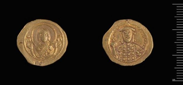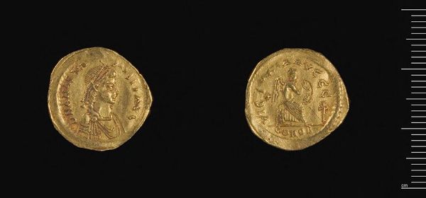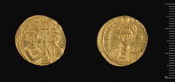 Curator: What strikes me immediately about this Byzantine coin is its luminosity. The gold practically radiates. Editor: Indeed. We're looking at a "Coin of Constantine IX" from the Harvard Art Museums. It's fascinating how a small object could carry so much weight. Curator: Absolutely. Gold itself has always been associated with divinity and power, and here, the image of Christ Pantocrator reinforces that. The emperor essentially positions himself under divine authority. Editor: It's a direct claim to legitimacy, mirroring imperial power structures within the church itself. This coin was not just currency; it was propaganda. Curator: Precisely. These images are not merely portraits; they are visual articulations of power, deeply embedded within a specific cultural and political context. Editor: It’s a powerful reminder that even the smallest artifact can reveal immense truths about its time.