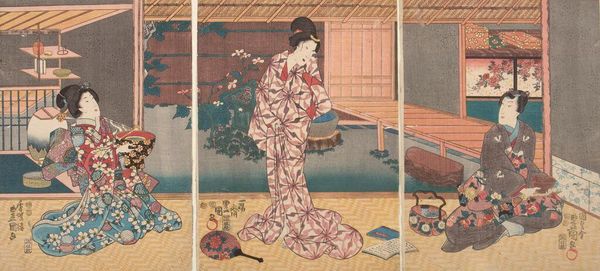 Curator: Here we see a woodblock print by Utagawa Kunisada, who lived from 1786 to 1865. The piece is titled "Scene from 'Rustic Genji' (Inaka Genji)". Editor: There's a captivating dreaminess about this print. The soft color palette and the woman's contemplative expression evoke a tranquil, almost melancholic mood. Curator: Kunisada was a leading designer of ukiyo-e prints, and this work connects to the larger cultural phenomenon of adapting classical tales for a broader audience. Editor: The floral patterns on her kimono are particularly striking. Do the cherry blossoms and rounded geometric shapes carry any specific meaning in this context? Curator: Yes, the blossoms are potent symbols of spring, beauty, and the fleeting nature of life, very common in Japanese art and carrying centuries of cultural memory. Editor: It's fascinating how Kunisada uses these visual motifs to link the narrative to deeper, more universal themes. I see it as a commentary on ephemeral beauty. Curator: Indeed. And Kunisada's commercial success reflects how artists navigated the evolving socio-economic landscape of Edo period Japan. Editor: Overall, it's a beautiful composition. I appreciate how the artist uses familiar symbols to elicit such strong emotions from the viewer, even today.
