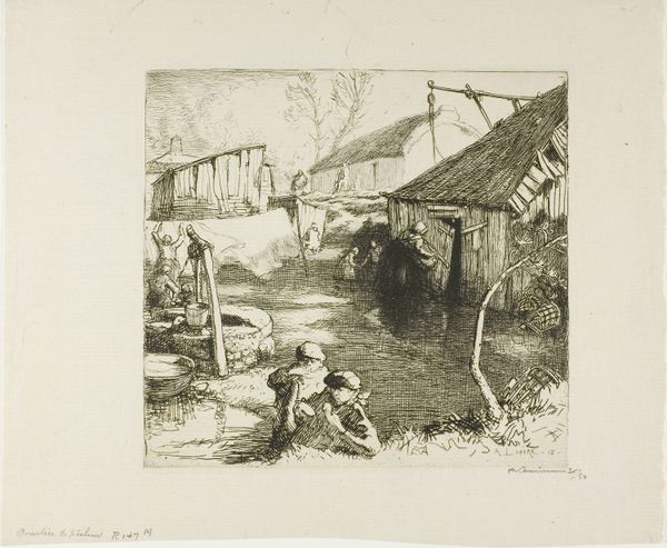 Editor: So, this is *Charlemont Bridge*, a 19th-century etching by George Taylor Plowman. It feels so…peaceful, almost wistful, like a memory fading at the edges. What catches your eye when you look at it? Curator: It whispers to me of simpler times, doesn't it? Covered bridges always evoke that nostalgia. The intricate detail in the etching is masterful. Notice how Plowman uses line to create texture – the rough wood of the bridge, the wispy branches of the tree. For me, the lone tree draws me in: a stark sentinel and patient witness. Tell me, what story does the bridge tell *you*? Editor: I think of community, a place where people connect. It’s interesting how the bridge and the tree both reach across, as if trying to touch each other. It makes me wonder about the unseen traffic – who crossed this bridge and what were their stories? Curator: Exactly! Plowman captured a moment frozen in time. Imagine the clatter of horse-drawn carriages, the murmur of conversations… Do you notice the texture of the sky versus the still reflection of the water under the bridge? Editor: Yes! It’s such a subtle detail, but it completely changes the atmosphere. The sky is so light and airy, while the water feels calm and still. So what do you make of its commentary on landscape? Curator: For me, Plowman gives the humdrum some character; a touch of transcendental reverence for the most average parts of town. It reminds me to look deeply at the beauty surrounding me, even when it may feel, at first, unremarkable. Editor: That’s a lovely way to think about it! I think I'll start paying more attention to those everyday scenes too. Curator: Wonderful! And I will admire George Taylor Plowman and covered bridges and lone sentinels with new insight. Thanks!