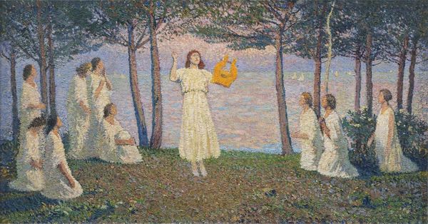 Editor: This is "Saint Barbara" by Mikhail Nesterov. The painting gives me such a feeling of melancholy and resilience. I’m struck by the composition—she’s kneeling, haloed, yet there’s a somber stillness in her pose against that vast landscape. How do you interpret the artist's choice of scenery and the overall mood he creates? Curator: Oh, darling, it's a whispered prayer on canvas, isn't it? Nesterov paints her not in gilded halls, but amidst a stark beauty—a silent testament to her faith against earthly trials. Look how the landscape mirrors her internal world, that hazy blue almost mournful, yet pregnant with dawn. It’s not just history; it's a spiritual theatre, a longing gaze towards something greater. Do you notice the sword laid to the side, almost forgotten? Editor: Yes! It almost looks like she chose faith over fight? Curator: Exactly! And what does the fragile tree suggest? For me, it is a powerful metaphor—perhaps endurance, steadfast even in seeming desolation? Art breathes, sweetheart. Let your senses guide you! I like that her halo is almost not there... she's close to Earth and connected. Editor: I hadn’t considered the landscape so deeply, it feels as crucial as Saint Barbara herself now that you mention it. Seeing the halo so faint really reframes her relationship to the landscape as well. Curator: Wonderful! It's about that human experience, distilled and offered up. Sometimes art echoes, sometimes it ignites! Editor: I’m definitely going to spend more time thinking about the settings of paintings now! Curator: Good, good. Keep listening, darling. The universe whispers its secrets if you lean in.