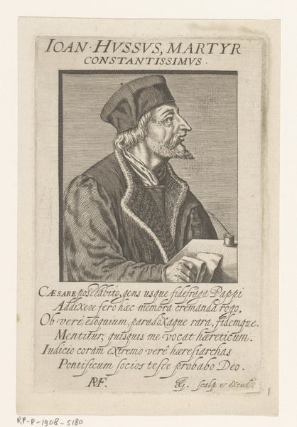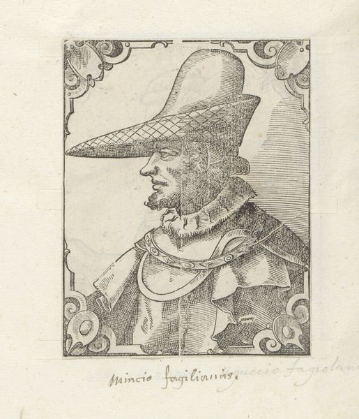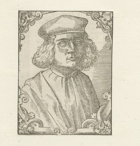 This is an anonymous portrait of Philip I, Landgrave of Hesse, rendered in engraving. The composition is dominated by the figure's upper body, framed within a decorative border that feels both ornamental and restrictive. Notice how the texture is achieved through dense, cross-hatched lines that define form and volume, creating a tactile quality despite the flatness of the print. The lines articulate the fur trim of his cloak and the feathered adornment on his hat. The gaze is direct, almost confrontational, inviting scrutiny and suggesting a complex psychological depth. This work participates in the broader historical discourse about representation and power. The formal constraints of the engraving medium highlight the tension between the desire for realistic depiction and the symbolic assertion of status. The piece questions what it means to capture an individual's essence within the framework of established social hierarchies. The very act of framing Philip within these ornate borders serves as a statement about his position and the controlled image he projects.