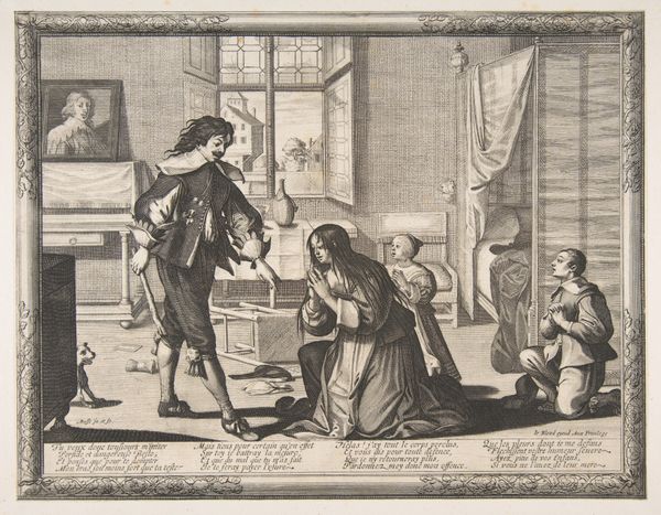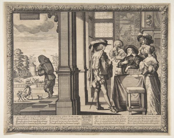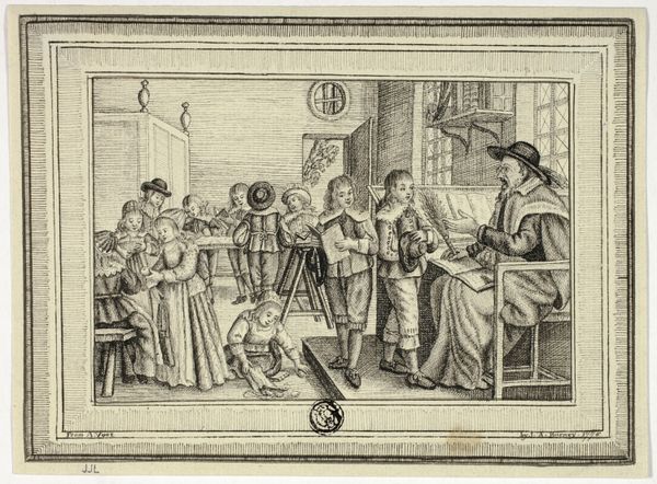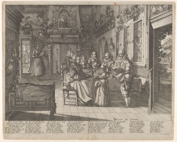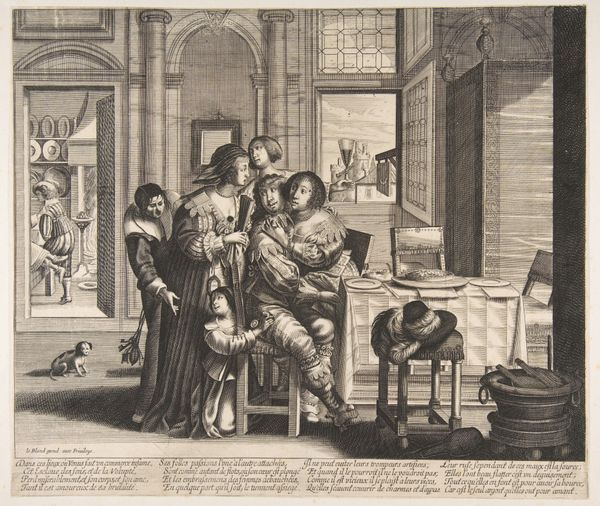 Curator: Look at this intriguing print. Abraham Bosse created "The Prodigal Son in a House of Ill Repute" sometime between 1631 and 1641. The engraving on laid paper now resides at the Metropolitan Museum of Art. Editor: My immediate reaction is a feeling of claustrophobia. It's as if we're peering into a gilded cage. The dense composition, combined with the fine lines of the engraving, makes for a rather oppressive atmosphere. Curator: Absolutely. Consider the socio-political climate in 17th-century France; it was one of great social stratification and moralizing critiques of excessive behavior. Bosse uses the parable of the Prodigal Son to comment on wealth, temptation, and moral decay within Parisian society. Editor: The figures almost spill out of the frame! There's a huddle of bodies around the presumed son, but the power dynamic feels unsettling. Note the way women are positioned; are they complicit or victims within this narrative? Curator: Exactly! Bosse engages the public role of art as moral instruction and social commentary. He highlights anxieties around wealth, leisure, and social mobility. It’s not just about religious morality but touches on social performance and the construction of identity. The "house of ill repute" becomes a microcosm of broader societal ills. Editor: And the technical execution further enhances this interpretation, doesn’t it? The engraving technique allows for minute detail – the opulent fabrics, the crowded interiors. I feel as though it almost becomes a catalogue of excess itself. It is almost as though by depicting it he somehow legitimizes it, which poses interesting questions for audiences of today! Curator: The dog in the corner is also interesting, seeming to be looking straight back at the viewer, knowingly... As always, reading into these themes provides so much to explore even within an early modern work. Editor: I agree completely, a complex print that speaks volumes about social structures.
