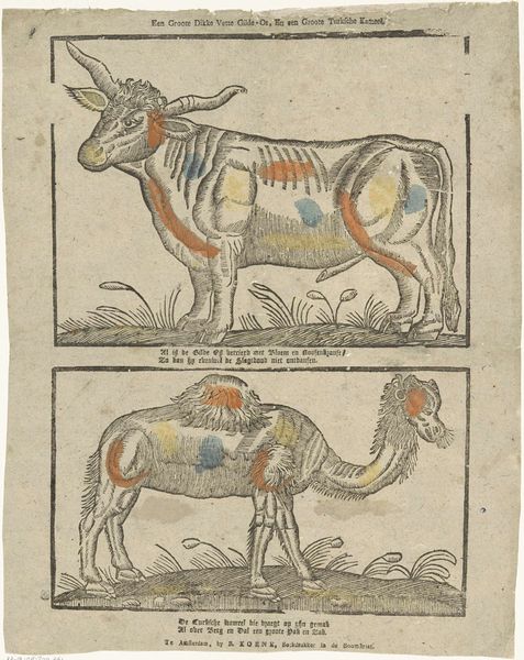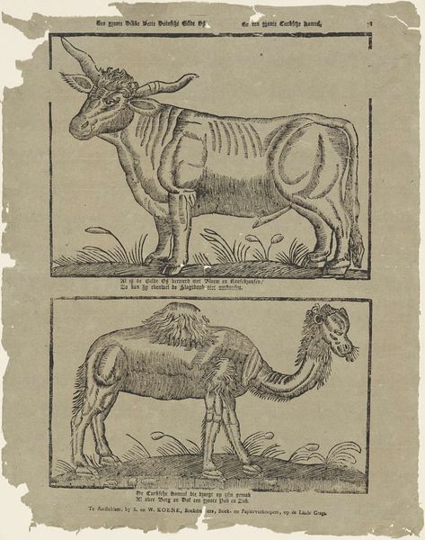 This image, titled Os en kameel, or Ox and camel, was made by Gijsbert de Groot Keur, and is a woodcut on paper. Looking closely, the first thing you might notice is the texture. It has a linear quality, acquired through the use of carving tools that form these creatures from the block of wood. The paper's fibres also affect how the ink settles, giving the image a tactile quality. The process of woodcutting involves a lot of physical work. De Groot Keur would have needed skill to carve the wood accurately, and to judge how much ink to apply to the block. Each impression requires careful hand-printing, a labor-intensive process. In the absence of machines, this print is imbued with the hand of the maker. The artist's care and effort are present in every line. The material and its making are inextricably linked, demonstrating how 'craft' is woven into the very fabric of fine art. By appreciating this, we come to a richer understanding of the image's place in history and its connection to the world of labor and commerce.