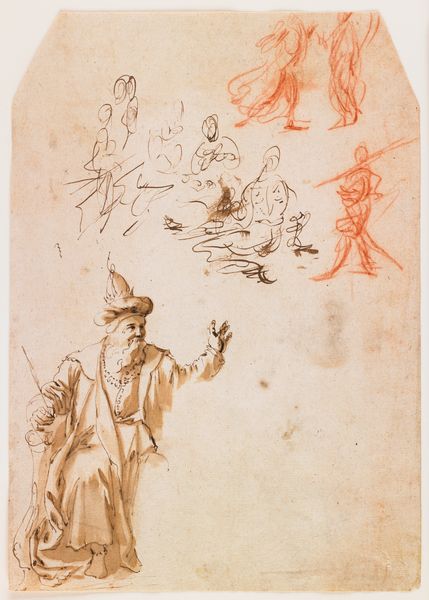This is Costume Design and Design for a Headdress, made with pen and brown ink, and red chalk by Baccio del Bianco in the 17th century. Del Bianco was a multitalented artist working during the late Florentine Renaissance, a period characterized by elaborate courtly entertainments. This drawing gives us a peek into that world, one where gender and class were performative. Note the figure's confident pose and ornate garments: the costume and headdress were potent symbols of identity. The artist, though, seems to challenge the rigid gender roles of his time. By designing costumes that blur conventional boundaries, he hints at the fluidity of identity and the theatrical nature of social roles. The drawing remains a reminder of how clothing and adornment can be used to both reflect and subvert the status quo. It encourages us to consider the emotional and personal resonance of how we present ourselves.