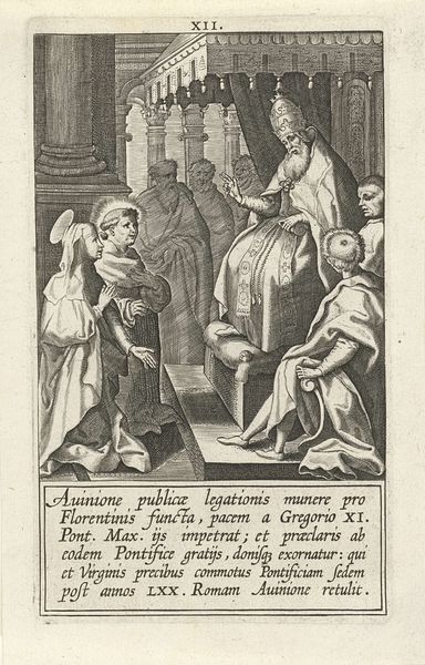 Theodoor Galle created this engraving, "Wijding van de heilige Dominicus," that's Dutch for "Consecration of Saint Dominic", at the turn of the 17th century. Its visual language speaks volumes about the social and religious climate of the time. Made in the Netherlands during a period of intense religious upheaval, the image portrays the Catholic rite of initiating a novice into the Dominican Order. Galle uses a rigid, hierarchical composition, with Saint Dominic kneeling before a bishop, surrounded by fellow monks. The setting is an idealized church interior, emphasizing the institutional authority of the Catholic Church. Note how the figure of the Virgin Mary overlooks the ritual from above the altar. Engravings like this served as powerful tools for religious propaganda during the Counter-Reformation, reinforcing traditional beliefs and practices in the face of Protestant challenges. To truly understand this image, we need to delve into the history of religious institutions in the Netherlands, exploring the power dynamics and social tensions of the era through archival research. Only then can we grasp the full significance of Galle's work.