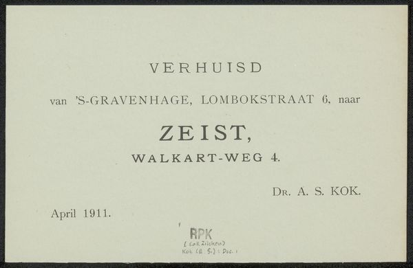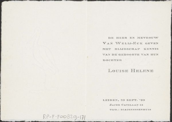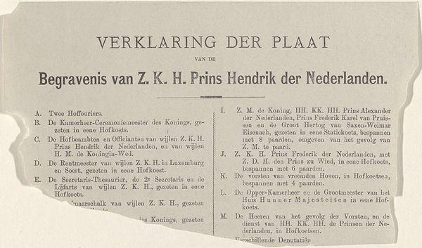 This is an announcement card for the passing of Frederik Hendrik Weissenbruch, created anonymously in 1887. The layout of the card features a stark contrast between the dark border and the pale, almost ghostly text. Typographical choices carry significant weight, and the varying fonts guide the eye through layers of information, from the immediate announcement of death to the bureaucratic details of the funeral arrangements. This hierarchy underscores a tension between public declaration and private grief. The formal arrangement of text acts as a cultural code, signaling respect and solemnity. The card's structure isn’t merely informative; it’s performative, enacting rituals of mourning and remembrance within a rigid framework. The choice of a standardized format speaks to broader societal norms. It's a fascinating reminder of how even the most personal expressions are shaped by existing structures.