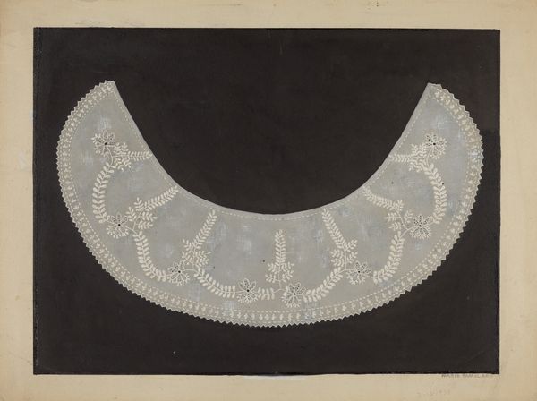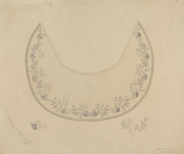 Curator: This lovely watercolor, ink, and pencil drawing is called "Bandbox Cover," and it was created by Gilbert Sackerman sometime between 1935 and 1942. What strikes you first about it? Editor: Immediately, I'm drawn to the melancholic mood. The monochrome palette and dense floral arrangement give it a rather somber, romantic air. Curator: It’s intriguing how the materials enhance that feeling. Sackerman likely used readily available, inexpensive materials, paper, pencil, ink, watercolor to craft this bandbox cover design. The design feels both precious and disposable. Do you think the material choice democratizes it somehow? Editor: Definitely, the accessibility of those materials would make the creation of such beauty possible for more people, blurring the lines between "high" art and domestic craft. And consider the symbolism – flowers, especially roses, traditionally represent love, beauty, but can also denote loss and the ephemeral nature of life. It’s a complex, visually coded message. Curator: And it's a very practical one too, no? Bandboxes were common for storing personal items, particularly hats, so these were decorative items used for everyday storage, and often covered with patterned papers. Think of the labor involved in decorating each box. Do the floral choices hint at Sackerman’s target consumer base perhaps? Editor: Possibly, there’s a stylized quality to these roses that also echoes art deco sensibilities. It might suggest this cover was designed to appeal to a particular modern, fashionable clientele of that period, but the image also speaks of something older than that decade; do you see in its imagery any other historic, romantic notions? Curator: Indeed. We also might wonder if the symmetry of this cover could hint at values beyond its immediate purpose; mirroring and symmetricality could, on a grander scale, reflect order, reason, and an aesthetically designed consumer culture emerging from its own historical conditions, in the inter-war period. It is fascinating to imagine these bandboxes sitting on shelves, these material expressions shaping identities in daily lives. Editor: I see it more as these repeating floral motifs mirroring the cyclical nature of life. Curator: I would venture both aspects – materials and images - can’t be mutually exclusive here. Considering the bandbox design alongside the accessible mediums used by the artist might also unveil their reciprocal play – each informing and amplifying the qualities inherent to the other. Editor: An enlightening observation. I appreciate how looking at this design from both an iconographic and materialist perspective has opened up new layers of interpretation. Curator: Precisely, together, we might discover what kind of beauty a humble object such as a bandbox cover, which on first glimpse evokes loss and romantic air, can truly reveal.