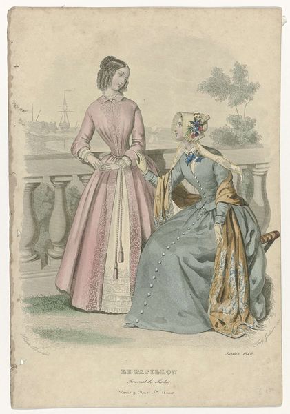 This lithograph from July 1838, made by an anonymous artist, presents a fashion plate featuring two figures in detailed attire. The composition strikes a balance between the figures and the architectural backdrop, hinting at an outdoor setting. The visual focus lies on the elaborate dresses, rendered with meticulous detail. The textures of the fabrics, lace, and trimmings create a rich, tactile impression despite the flat medium. Color plays a subtle yet significant role, distinguishing the garments and adding depth. The formal structure of the lithograph—the layering of textures, the interplay of light and shadow, and the careful arrangement of elements—serves not merely to depict fashion but to evoke a sense of material culture and social identity. Here, clothing functions as a semiotic system, conveying status, taste, and adherence to contemporary ideals. The lithograph reflects a broader cultural discourse around appearance and social roles in the 19th century.