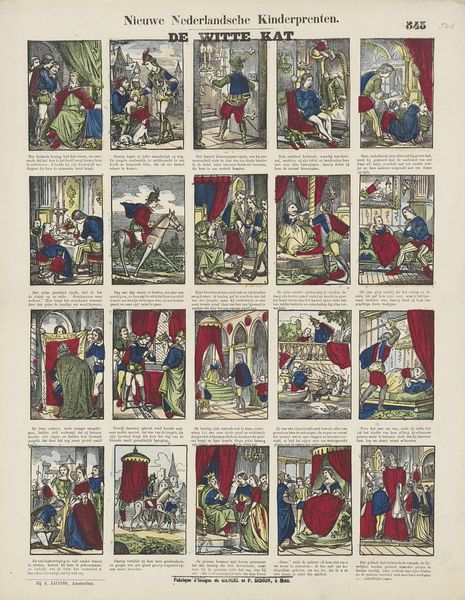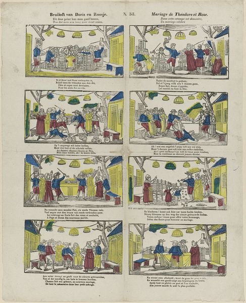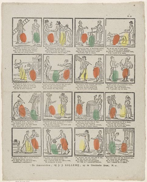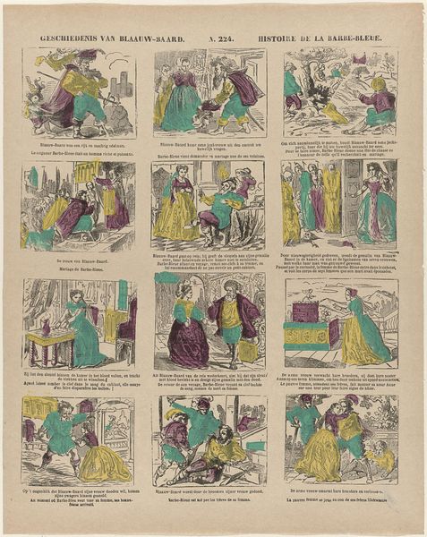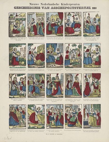 Editor: So, here we have Philippus Jacobus Brepols's "Geschiedenis van de kleine Aschpoester / Histoire de la petite Cendrillon," created sometime between 1800 and 1833. It’s a print, with etching and engraving. It feels like a comic strip telling the Cinderella story. What stands out to you? Curator: What I find compelling is how this piece reframes Cinderella within the context of print culture. Consider the potential audience – was it primarily children, or were there other social or political messages being subtly encoded for adults too? What statements might Brepols be making regarding the power dynamics inherent in stories circulated within society? Editor: That's an interesting point about power dynamics. I mostly focused on the visual narrative. Curator: And the visual narrative is crucial. Look at how Cinderella is portrayed across these scenes. Are there visual cues suggesting class or gender roles? Notice how clothing, posture, and the activities depicted in each frame might reinforce or challenge prevailing societal norms of the period. Editor: I see what you mean. She’s always depicted in subservient roles, even when transformed for the ball, her beauty is serving the power structures. Does the medium itself—printmaking—play into the reading? Curator: Absolutely! Print was a widely accessible medium, allowing for dissemination of ideas and stories to a broad audience. Considering the context of Romanticism, how might Brepols be using this accessible format to either reinforce traditional societal structures or to plant seeds of subtle dissent, perhaps even inspire viewers to question their own social standing? Editor: That gives me a whole new perspective on what might seem like a simple fairytale illustration. Thank you! Curator: It is a pleasure to engage with such layered and historically relevant artwork. I have certainly found new nuances in our dialogue.