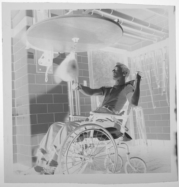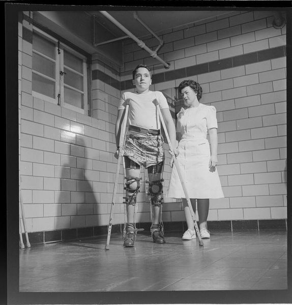 Editor: This photograph by Jack Gould pictures a child on crutches with a nurse, and I find myself drawn to the clinical starkness of the scene. What strikes you about this image? Curator: The photograph's power resides in its institutional context. The cold, tiled walls and the nurse's watchful presence speak to the history of medical care and its often impersonal nature. Editor: So, it’s about the setting influencing our understanding? Curator: Precisely. How do socio-political structures, in this case healthcare, impact individual experience? How might the public presentation of such images affect perceptions of disability? Editor: I hadn’t considered the broader implications. It's more than just a portrait; it's a commentary. Curator: Indeed. The photographer prompts us to question the relationship between the individual, the institution, and the gaze of the viewer. Editor: That’s given me a lot to think about. Thanks!