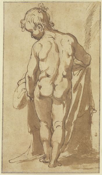 Editor: This etching by Andrea Schiavone, dating back to the mid-16th century, is called "Cupid viewed from behind holding an arrow in his raised right hand, a bow in his left". It's currently housed at the Metropolitan Museum of Art. It has a vulnerable mood, doesn't it? A glimpse, almost voyeuristic. How do you interpret this work? Curator: Voyeuristic is an interesting choice! I feel the artist offers us an unexpected view into a traditionally glorified subject. Forget the cherubic face; we see Cupid from behind, almost vulnerable, his attention elsewhere. Do you notice how the sketchy quality and the reverse view lend it an air of intimacy, a quiet moment before or after the act of love? Perhaps Schiavone is suggesting love isn't always as straightforward as a direct hit with an arrow. It can be awkward, fleeting, and definitely unseen by the intended. Editor: That's insightful. So, it's less about idealizing love and more about capturing its more realistic, less glamorous moments. I hadn't considered the sketchiness contributing to that feeling. It makes it seem so much more personal. Curator: Exactly! Think of it like catching a glimpse of a secret. Were we *meant* to see him like this? Maybe that’s the arrow he aims – surprise! It transforms Cupid from a symbol to something... human, no? Editor: I agree completely. I initially just saw the nudity, but I missed that unexpected quality. This glimpse is a reminder that there's always more to the story, a hidden side, even to love. Curator: Precisely! And that hiddenness... that vulnerability, is where so much beauty, and truth, often resides, wouldn’t you say? A side door to something more compelling.