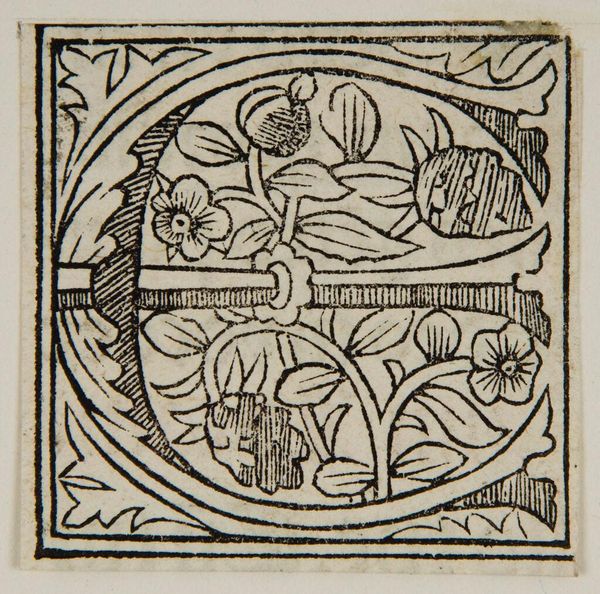 Curator: This woodcut, titled "Letter C," is part of a series of initial letter designs, its artist, unfortunately, remains unknown. It resides here at the Harvard Art Museums. Editor: It's immediately striking how the bold, black lines create a sense of contained growth, like a garden forcing its way out. Curator: Observe how the "C" itself becomes part of the organic framework, seamlessly integrating with the floral motifs. Note the contrast between the letter's rigid geometry and the fluid, natural forms of the blossoms. Editor: And roses! Symbolic of secrecy, beauty, and love, all intertwined within the constraints of the initial "C." What stories might begin from here? Whose initial is this, and what privileges might they hold? Curator: The composition's success relies on the interplay between positive and negative space, generating a dynamic tension. The formal constraints enhance rather than detract from its beauty. Editor: Yes, and these constraints speak to societal structures that historically restricted expression and identity. Anonymity here becomes a quiet rebellion against authority. Curator: A fascinating synthesis of form and function. Editor: Indeed, it's a simple character that provokes profound questions about power, identity, and representation.