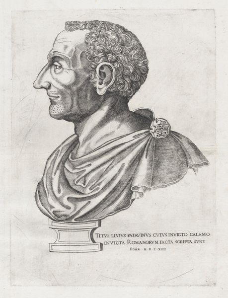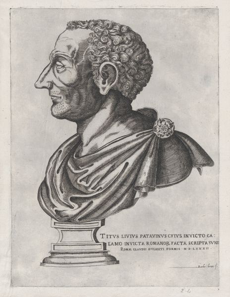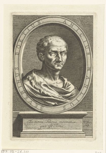 Curator: Tell me about this print. Editor: This is a portrait of Marcus Tullius Cicero, made in 1566 by René Boyvin. It’s an engraving. The lines are incredibly fine and detailed. What strikes me is the clear skill involved in its creation, so different from today's mass-produced images. What can you tell me about this engraving from a materialist perspective? Curator: Well, consider the labour involved. Every line you admire was etched painstakingly into a metal plate. This wasn't just about artistic vision; it was about skilled craftsmanship, a trade learned through years of apprenticeship. How do you think the act of engraving itself shapes the final image? Editor: I suppose the medium dictates a certain formality and precision. Unlike painting, where you can blend and layer, engraving demands a clear, deliberate mark. Do you think the choice of printmaking had social or economic implications? Curator: Absolutely. Prints democratized images. Unlike unique paintings reserved for the wealthy, engravings could be reproduced and distributed widely. This impacted how Cicero's image and ideas were disseminated throughout society. Whose patronage would be involved in the creation of this image and its subsequent distribution? How might this portrait have influenced perceptions of Cicero in the 16th century? Editor: It makes me realize that art production is also about labor and market access. Boyvin wasn't just expressing himself; he was participating in a complex system of patronage, production, and distribution that deeply impacted society. Curator: Precisely. And seeing the portrait this way allows us to view it not just as an object of aesthetic beauty, but as a artifact within the larger fabric of social and economic life of the era.