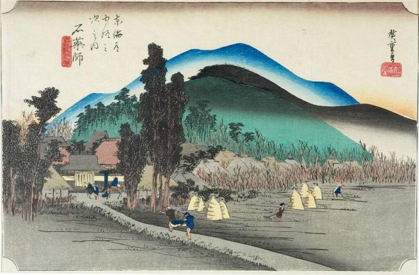 Curator: This vibrant print, titled "Ishiyakushi--Ishiyakushiji Temple", comes to us from the hand of Utagawa Hiroshige around 1832 or 1833. Its skillful combination of ink and color on paper brings a certain serenity to the depicted scene. Editor: It certainly does, a tranquility that almost belies the small flurry of activity depicted. I'm immediately drawn to the contrasting color fields, the deep blue of the mountain juxtaposed with the amber tones of the harvest field, creating an almost dreamlike atmosphere. Curator: Absolutely, the composition offers a fascinating study in contrasting forms and planes. Notice how the undulating rhythm of the land and the sweeping lines of the mountain are anchored by the rectilinear forms of the buildings. It is through these compositional techniques that we comprehend visual hierarchy in Hiroshige's landscape. Editor: And yet, it is also these individual structures that contain symbols and speak volumes, as do the tiny figures depicted in such dynamic, decisive terms! The temple, for example, what would a pilgrim see reflected back to them on encountering the scene of temple amidst landscape? The landscape itself may almost stand in for a mandala, or meditative focus... Curator: That's a compelling interpretation, bringing in that idea of pilgrimage. Considering this work’s probable origins as part of a sketchbook, and its debt to the plein air tradition, I suggest instead the focus should turn to Hiroshige's masterful employment of line, the economical brushstrokes bringing specificity to natural elements—the texture of harvested reeds, the massing of trees against the foot of the hill—as the artist recorded his experience of a specific site and time. Editor: A beautiful, immediate impression that still evokes layers of accumulated history! I find it endlessly fascinating how a single image can invite such distinct modes of appreciation. Curator: Indeed. Such diverging ideas reinforce the multilayered significance of visual art, a convergence of observation, practice, and symbolic meaning that deserves continual examination.