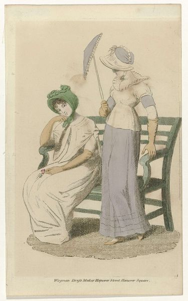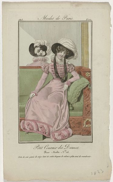 Curator: This print, "Petit Courrier des Dames, 1823, No. 116" from an anonymous artist, showcases early 19th-century fashion. Etched lines filled with delicate color…what immediately strikes you? Editor: Well, the detail on the dresses is pretty remarkable, especially considering it's a print. I’m curious about the amount of labor that went into creating those lace details and embellishments, both in reality and in representing it in this medium. Curator: Precisely. Look at how the print functions as a record, almost an advertisement, of the incredible textile production of the era. Think of the workshops and the people involved. Editor: So, it’s less about artistic expression and more about the display of available commodities? Curator: It is both. The etching and the color contribute to the allure, enticing the consumer. The “Petit Courrier des Dames” served a real purpose. Did these prints celebrate artistry or promote consumption? Editor: Possibly both, simultaneously. The skill in rendering the fabrics elevates it beyond a simple catalog, but its primary function was commercial. The contrast between the delicate aesthetic and the labor involved is interesting. Curator: Think of the materiality here. Paper, ink, dyes, the fabrics themselves… Consumption then had tangible form in everyday life. Editor: That makes me consider how our perception of fashion images may change by just thinking about its context. Thank you. Curator: It's a dialogue between the creation, consumption and circulation that’s vital to understand these works beyond their immediate aesthetic appeal.