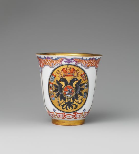 This porcelain beaker was made by the Meissen Manufactory in the 18th century, a period defined by elaborate displays of wealth and power through decorative arts. Consider the symbolism: the prominent crown and elaborate monogram aren't mere decoration. They reflect the hierarchical structures of the time, where identity was inextricably linked to social status. Porcelain, itself a luxury good, elevated the status of its owner. The very act of drinking from such a vessel becomes a statement of privilege. These objects offered a canvas for projecting identity, but also a means of reinforcing existing social divisions. What does it mean to create and consume art that perpetuates such disparities? This beaker invites us to consider the complex relationship between beauty, power, and social identity.