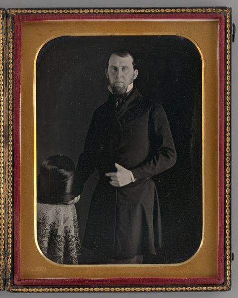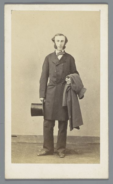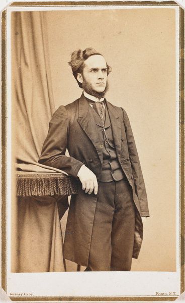 This is a photograph of Joseph Kings by Jeremiah Gurney. In this portrait, Kings is captured in a formal pose. The composition is immediately striking for its structured arrangement, featuring a vertical orientation that emphasizes the subject's height and presence. The photograph employs a subdued palette of sepia tones, which creates a sense of timelessness, while the soft gradations of light and shadow model the subject's features and clothing, adding depth to the image. Consider how the contrasting textures—from the smoothness of the draped cloth to the crispness of Kings' jacket—enrich the visual experience. These textural elements introduce a semiotic dimension, where each component signifies aspects of status, identity, and the era's aesthetic values. The formal composition and muted color palette invites us to decode the cultural and social narratives embedded within the photograph.