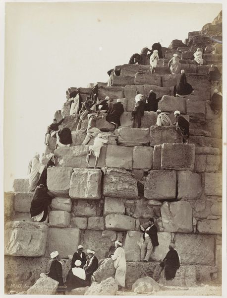 This albumen print by Félix Bonfils captures a moment of exertion and achievement at the Great Pyramid. The sepia tones create a textured surface that emphasizes the rough, monumental scale of the pyramid's stones, in contrast to the smooth sky. The composition directs our gaze upwards, following the diagonal line of figures as they ascend. The structure of the photograph highlights a tension between human endeavor and the imposing, timeless geometry of the ancient structure. Notice how the figures are arranged in a way that accentuates the steep incline, their forms echoing the pyramid's own angles. Their struggle is a kind of performance against the backdrop of historical monumentality. Bonfils challenges established meanings through framing the pyramid not just as an object of awe, but as a stage for human interaction, a site of personal experience. He invites us to contemplate how we engage with history and the spaces we inhabit, suggesting that meaning is made through interaction. The photograph creates an evolving dialogue between the present and the past.