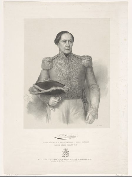 Editor: So, this is "Portret van generaal Changarnier," a pencil drawing made in 1848 by Marie-Alexandre Alophe. The general's stance is so confident. What symbolic weight do you think it holds, knowing what you do about art? Curator: Notice the crisp lines, almost like an engraving, even though it’s pencil. It reminds me of Neoclassical portraiture, aiming for that aura of enduring heroism. But the symbols... the uniform, that confident hand on the hip, aren’t just about military might. How do you see his gaze, in relation to what we know of that era, that revolutionary period? Editor: I suppose it suggests a steady leadership during unstable times? Is there more to unpack in how he’s depicted? Curator: Consider the subtle details, almost whispers in the visual language. His hand isn’t clenched, it's relaxed. His eyes meet ours, but softly. The medal, prominent, denotes service. Together, these are clues. In the turbulent year of 1848, images such as this, circulated widely. How did such portraiture influence, or cement, public perception of such figures? Editor: So, the portrait does more than depict him—it presents a calculated image of authority? Curator: Precisely. He’s not just Changarnier, he’s the *idea* of Changarnier: duty, stability. A beacon of order amidst societal upheaval. Doesn't that connect to current visual presentations of leaders in our own media? Editor: Absolutely. This has definitely given me a new perspective on how even seemingly straightforward portraits carry cultural and political messages. Curator: Indeed! Seeing through the eyes of the past also allows us to better see our own world.